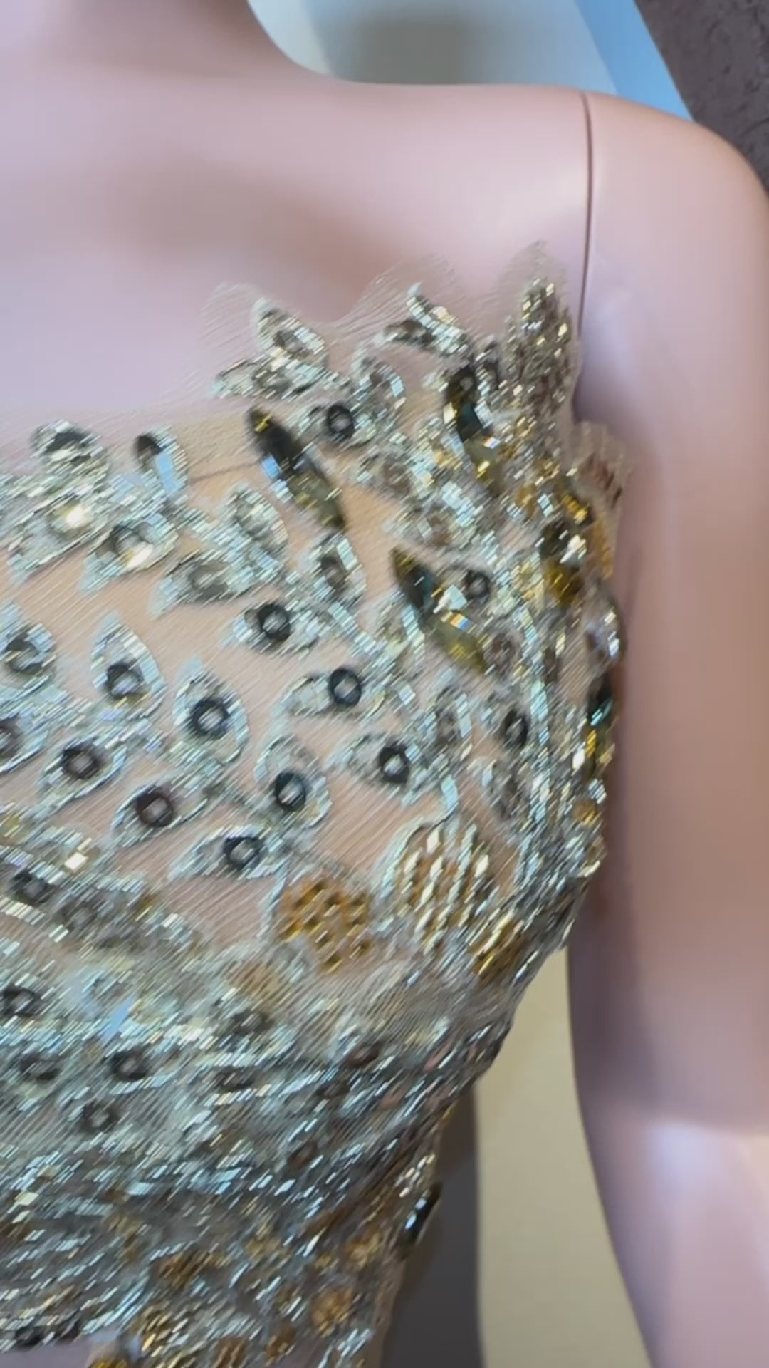 GOLD 2PC SET WITH CRYSTAL EMBELLISHED CORSET TOP AND STRETCH SKIRT WITH HIP TO FLOOR LENGHT SASH